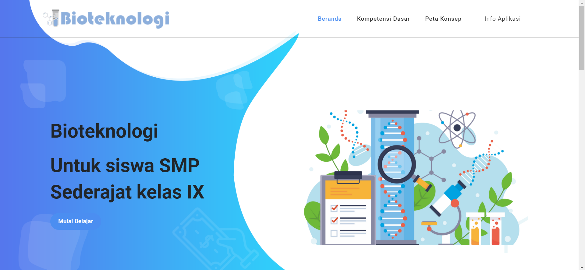 dihalaman ini terdapat tombol Mulai Belaja ketika memilih maka yang akan muncul adalah halaman materi, menu kompetemsi dasar menampilkan pencapaian yang akan dicapai, menu peta konsep menampilkan gmabar peta konsep, menu informasi memampilkan biodata pembuat aplikasi.